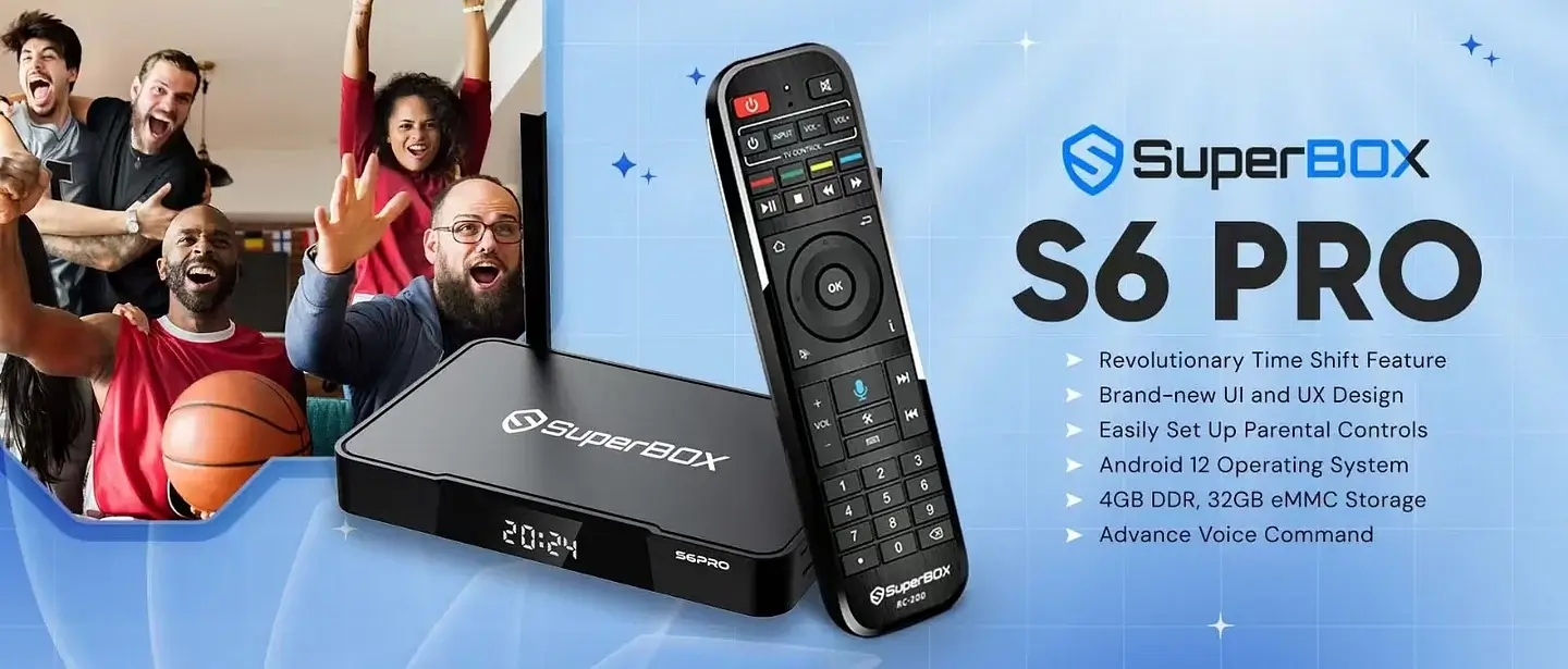 The SuperBox S6 Pro is a common edition of SuperBox S6 series from 2024-2025. Retained all core features of SuperBox S6 Max and S6 Ultra but cheaper price. With its revolutionary Time-shift feature, the SuperBox S6 Pro allows you to catch up on programs from the past 8 hours, ensuring you never miss a moment of your favorite shows. Equipped with 4GB of RAM and 32GB of storage. Enjoy lightning-fast streaming, thanks to its 1000Mbps Ethernet connection, dual-band WiFi, and cutting-edge WiFi 6 technology. Plus, the upgraded Bluetooth remote with voice command makes navigating your content effortless.