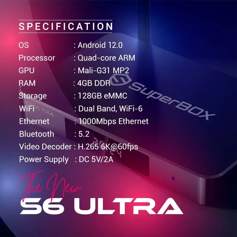 128GB Storage: The SuperBox S6 Ultra doubles the storage capacity compared to the S6 MAX, offering an impressive 128GB of eMMC storage. This additional space allows you to store more apps, content, and media, ensuring that you always have quick access to your favorites without worrying about running out of space.